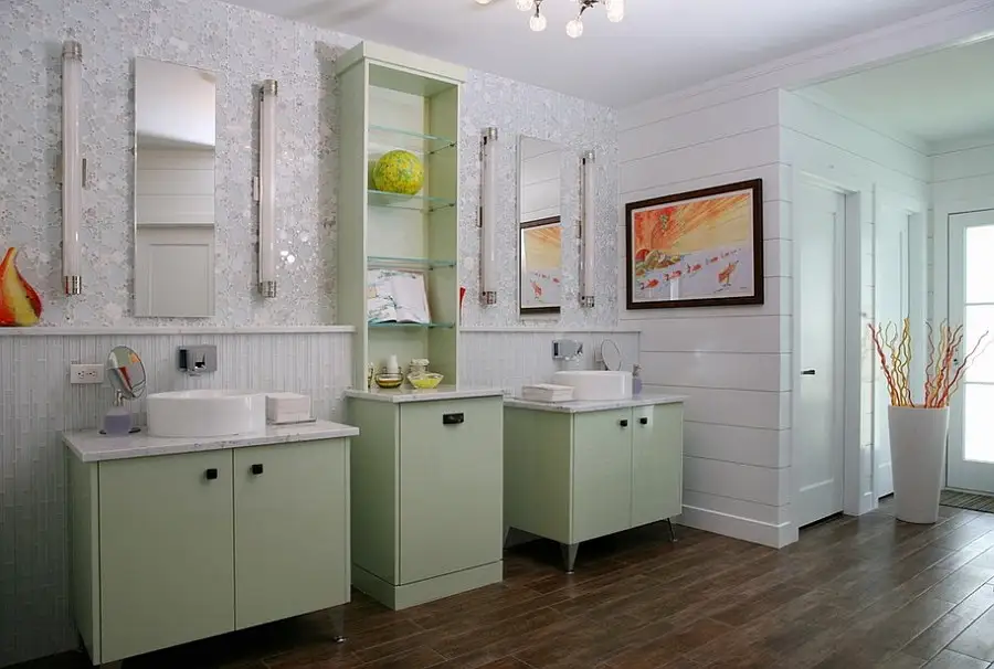 O asociere “cuminte” este verdele menta si albul. O recomandam in special in baile mici si inguste. Folositi alb pentru pereti si verde pentru dulapul de sub chiuveta si dulapul in care depozitati diverse articole pentru baie.