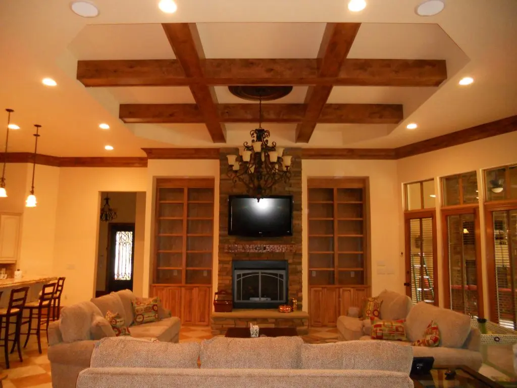 Tavan cu grinde din lemn si leduri