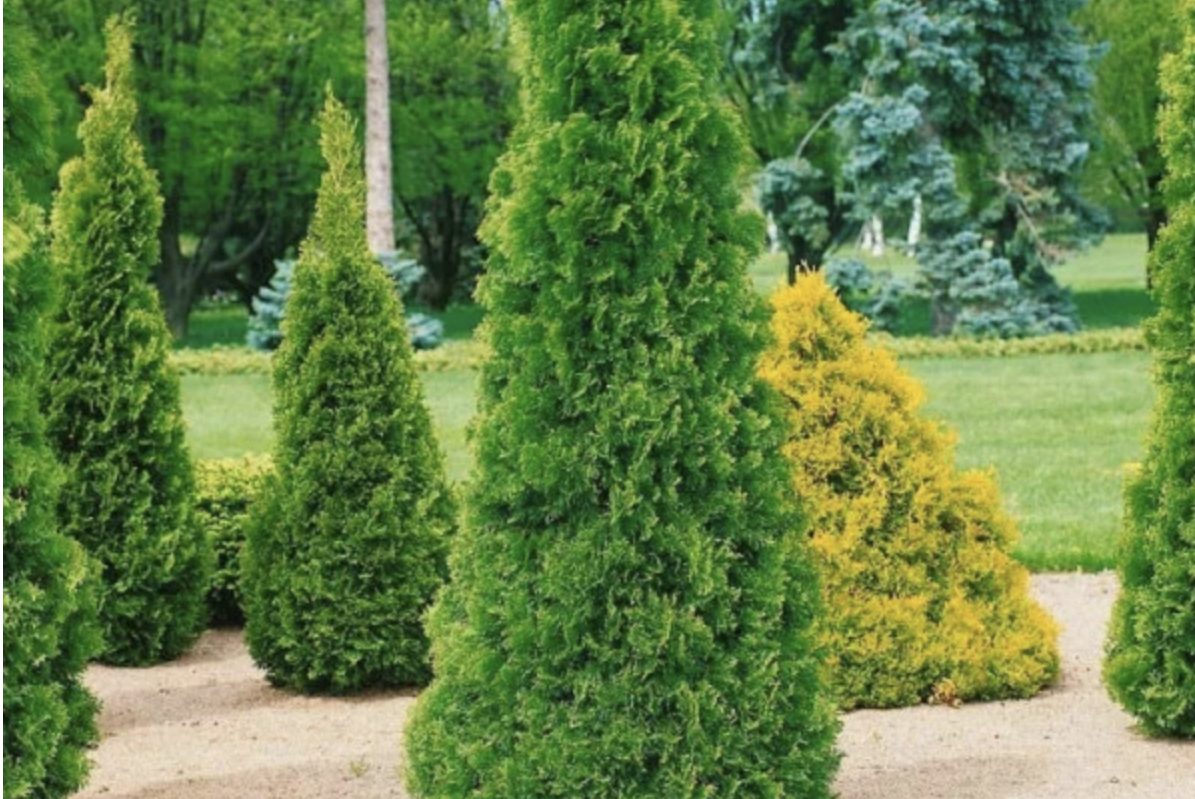 Perfect pentru un ecran verde rapid, acest copac conifer se poate lăsa să atingă dimensiunea completă sau să fie tăiat ca gard viu. Frunzișul dens și verde creează eleganță în peisaj, dar poate fi predispus la boli în anumite zone, unde tuia „Green Giant” este o alternativă mai sigură.