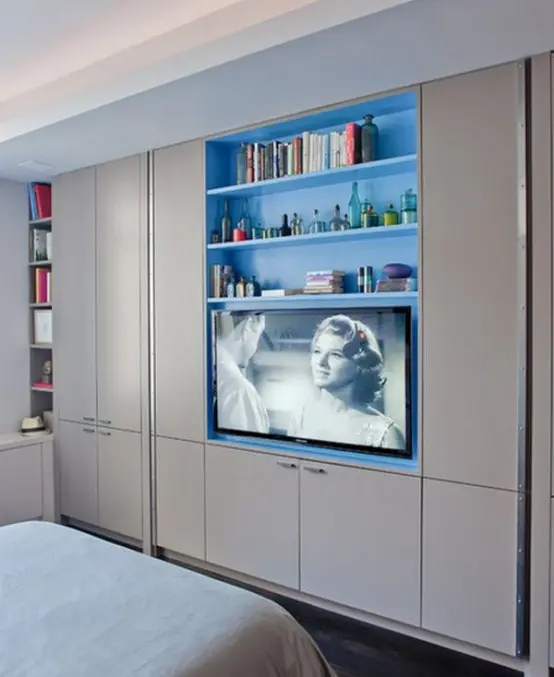Model de dulap incastrat in perete incluzand chiar si un tv si rafturi deschise pentru decoratiuni.