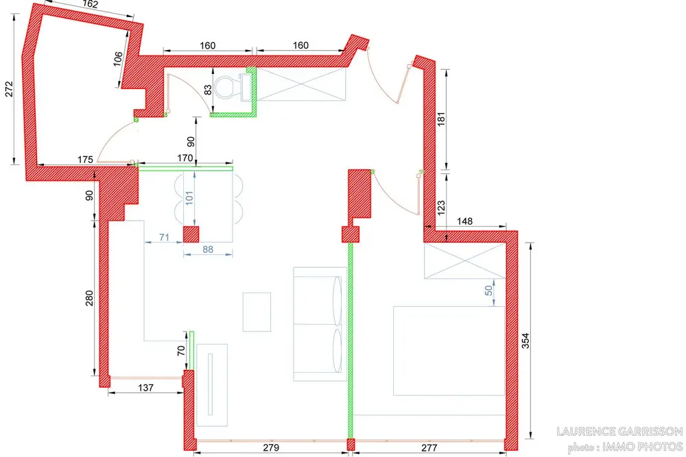 Bucataria este una restransa, dar micile trucuri la care Laurence a apelat ne arata ca poti sa te descurci si intr-un astfel de spatiu. In dreptul geamului din bucatarie, a fost instalata chiuveta, iar pe cealalta latura a mobilierului (in forma de L) dulapuri pentru depozitare, plita si cuptorul.