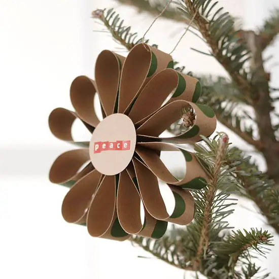 Flori de carton cu mesaje – pentru acest ornament iti trebuie o bucata de carton din care sa tai fasii de latimi egale si lungimi egale. Capseaza fasiile la capete formand o petala. Dupa ce ai capsat toate fasiile lipestele pe toate circular pe un carton. La final scrie un mesaj frumos pentru cei dragi si agata ornamentul in bradul de Craciun.
