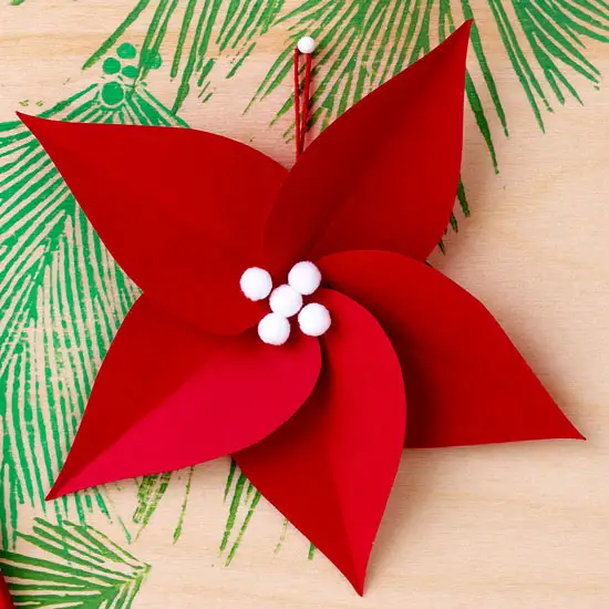 Decoratiuni florale handmade – deseneaza pe un carton tiparul petalelor florii, cate iti doresti tu, apoi decupeaza-le si suprapune-le ca in imagine. Mijlocul florii il poti realiza fie din vata, din material textil sau din polistiren. Pe spate lipeste un carton rotund ca sa fixezi floarea si prinde-i un snur rosu cu care sa o poti agata in brad.