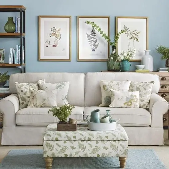 Excelenta imbinare intre verdele pal din fundal si accentele de albastru de pe pernele decorative!