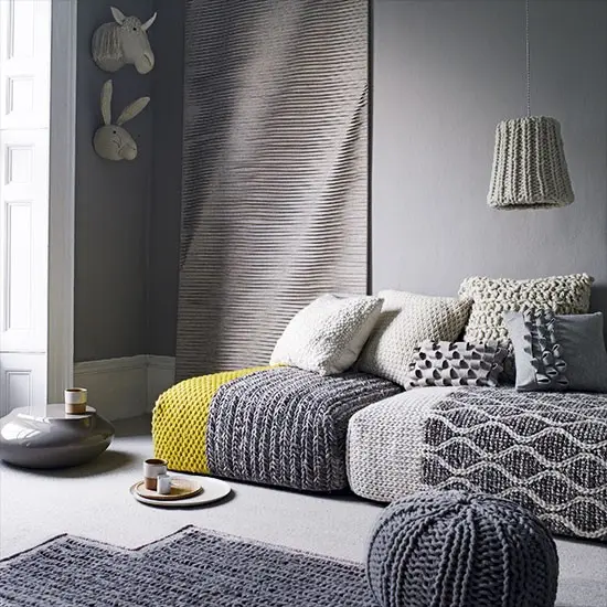 Tonuri de griuri si un detaliu cu galben! Foarte elegant acest living