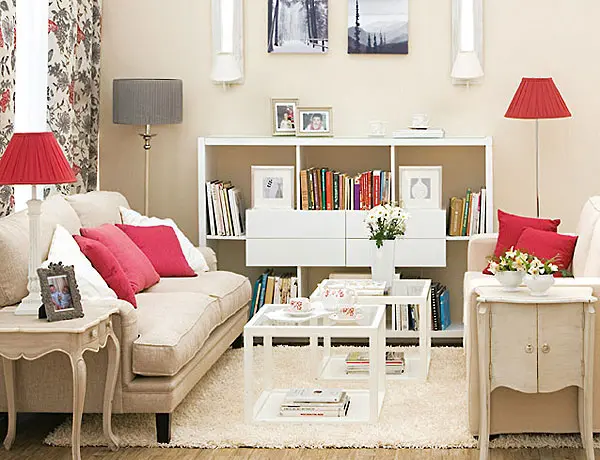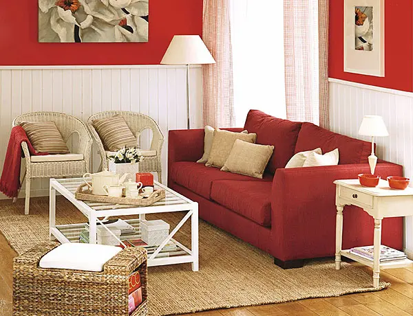Iti plac culorile puternice? Iata o propunere indrazneata: rosul. O idee buna mai ales daca incaperea are orientare spre nord. Accentele de rosu vor incalzi camera si vor dinamiza amenajarea. Amenajarea propusa se bazeaza pe un fundal neutru pe care sunt adaugate accentele de rosu. In cazul nostru, canapeaua are o nuanta de rosu bine aleasa, suficient cat sa nu oboseasca ochiul. Peretii sunt zugraviti cu o nuanta vie de rosu, dar doar de la jumatate in sus, partea inferioara fiind amenajata sub forma unor lambriuri albe care echilibreaza intensitatea culorii.