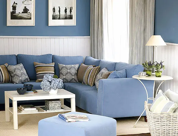 Iti doresti un stil elegant, dar relaxant si confortabil in acelasi timp? Foloseste nuante de albastru, completate cu alb si gri. O canapea tip coltar, o masuta alba cu decoratiuni in diverse tonuri de albastru, perne decorative pe masura si o masuta laterala alba cu o lampa. Pentru pereti poti incerca aceeasi abordare cu lambriuri albe folosita in cazul livingului cu rosu.