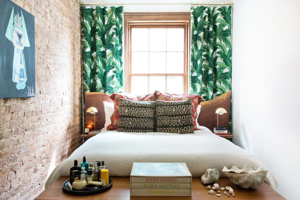 Decorul anost. O locuinta mica nu inseamna o limitare din punct de vedere al optiunilor privind decorul. Asadar poti aduce o nota aparte spatiului prin incorporarea unor modele cu accente luminoase sau in culori indraznete. In camera din imagine draperiile colorate lipite de tavan distrag atentia si il fac pe privitor sa uite ca incaparea este atat de mica, punctul de interes fiind modelul atragator al panzei.