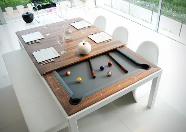 Masa de biliard cu masca pentru a deveni o masa practica este mereu o varianta buna pentru livingul tau. Optand pentru aceasta varianta vei avea si o parte interactiva la tine in sufragerie sau pe terasa.