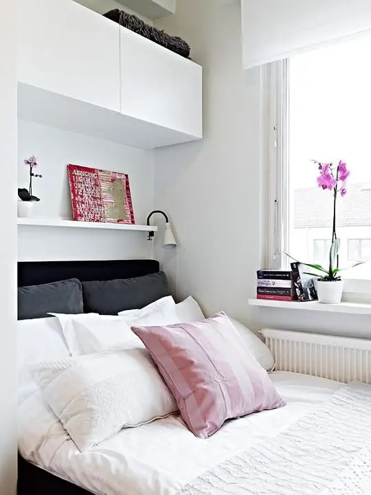 Un pervaz adanc poate functiona cu succes ca spatiu de depozitare in orice dormitor ingust. Profita de el!