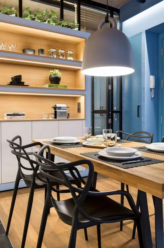 Jocul luminilor creeaza diferite scenografii in cadrul amenajarii. Luminile indirecte pun in valoare textura caramizilor, iar benzile montate sub rafturi aduc un plus de lumina de accent necesara in spatiile de lucru. Corpul de iluminat supradimensionat montat deasupra mesei atrage in mod special atentia.
