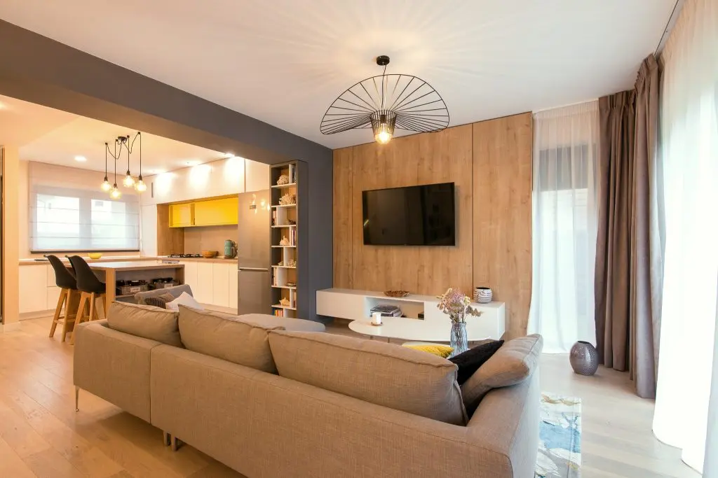 Clientii nu au vrut sa includa in amenajarea locuintei lor tapetul sau vopseaua decorativa; insa au aprobat cu entuziasm varianta unei placari cu placi de lemn a peretelui din spatele televizorului din living si a peretelui din spatele patului matrimonial (accentuat prin iluminare cu led).
