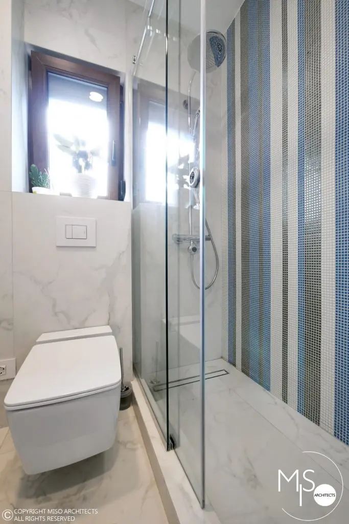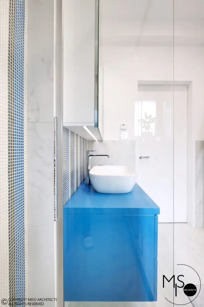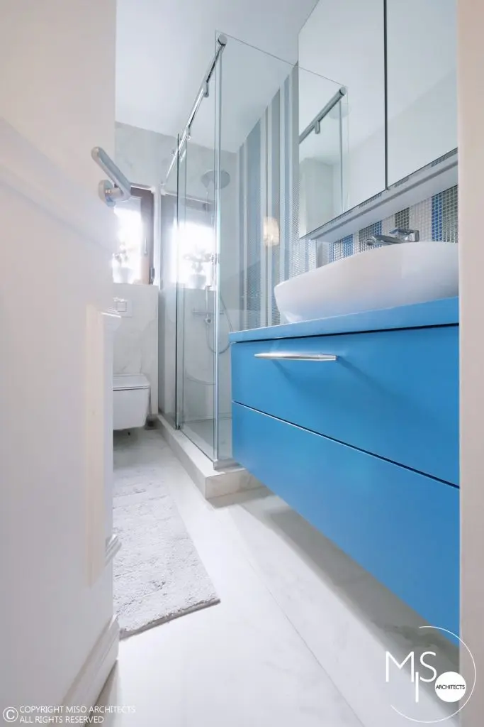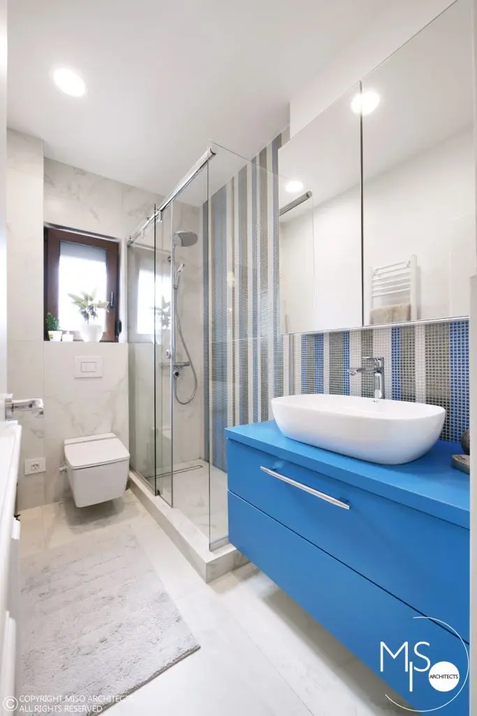 Baia a fost regandita in intregime fata de aspectul initial, finisajele ceramice si obiectele sanitare fiind atent puse in scena. Si aici vom regasi albastrul ca motiv cromatic principal, atat la nivelul mozaicului cat si al mobilei.