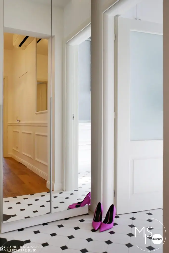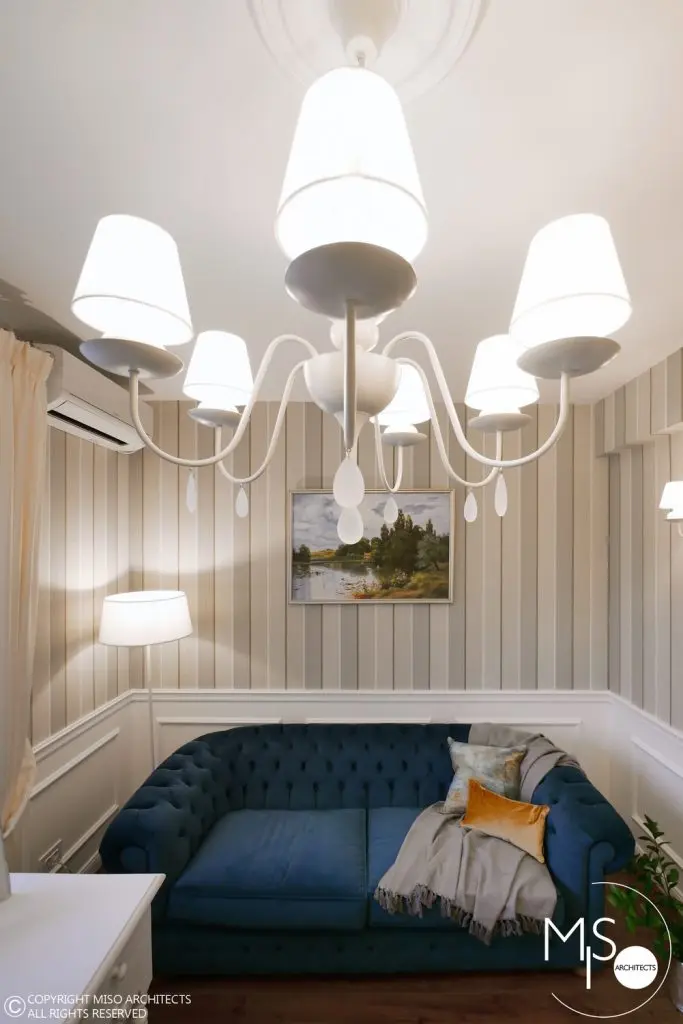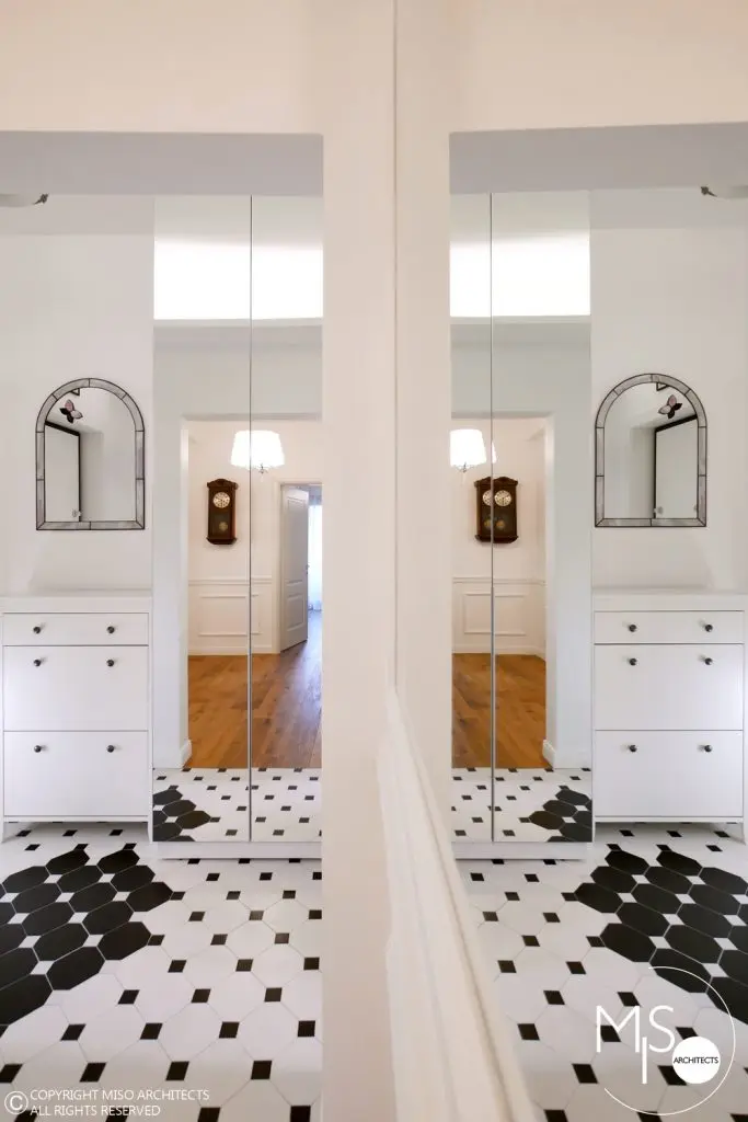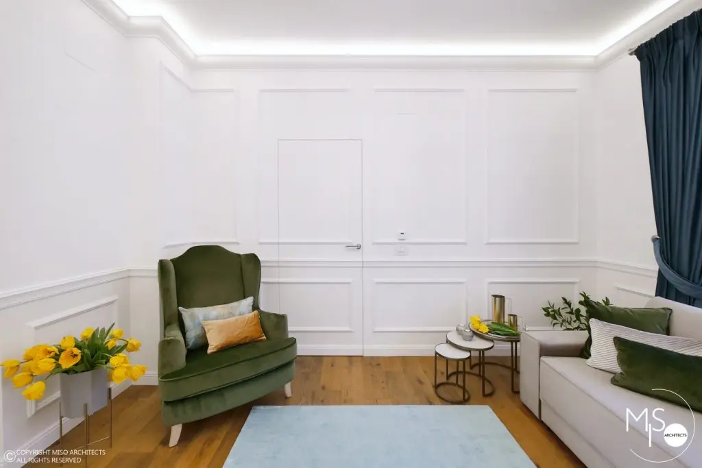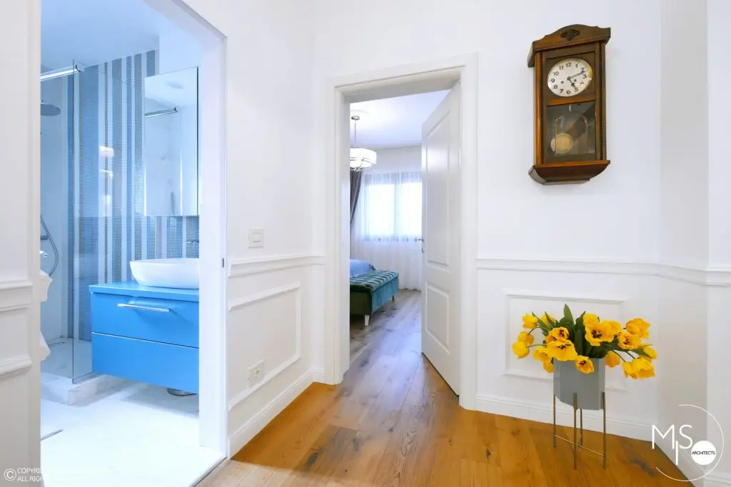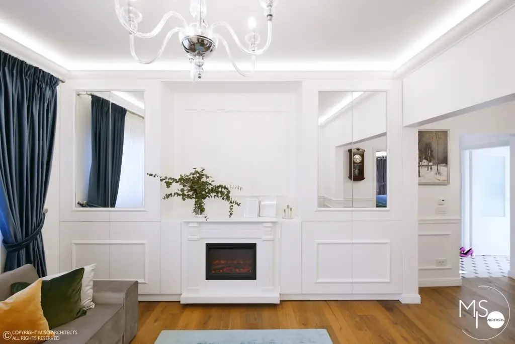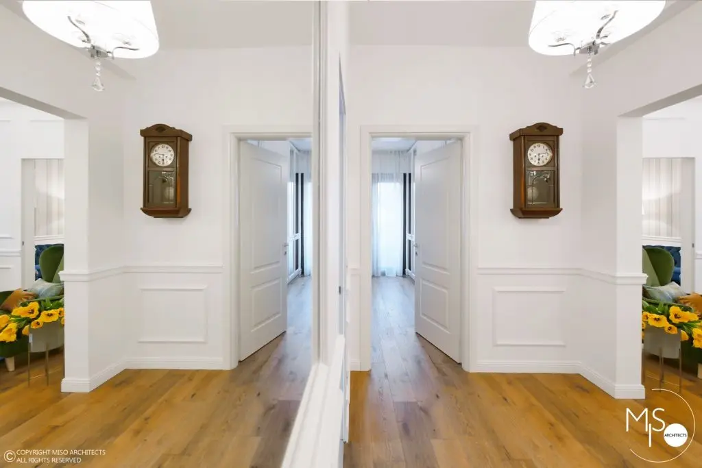 In cadrul acestei amenajari s-a folosit o gama larga de profile decorative, fiind elemente de baza al proiectului. Un alt detaliu deosebit il reprezinta usile ascunse cu sistemele de feronerie mascate astfel incat sa se alinieze cu linia peretilor si sa para ca ar face parte integranta din acestia. La nivelul pardoselii din hol si bucatarie, s-a ales o dispunere de placi alternate cu patratele intr-un joc alb-negru. Acest finisaj se potriveste perfect cu imaginea interbelica a imobilului, iar pardoseala din lemn de stejar cu o culoare calda si primitoare completeaza cromatic tabloul de ansamblu.
