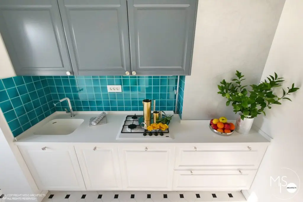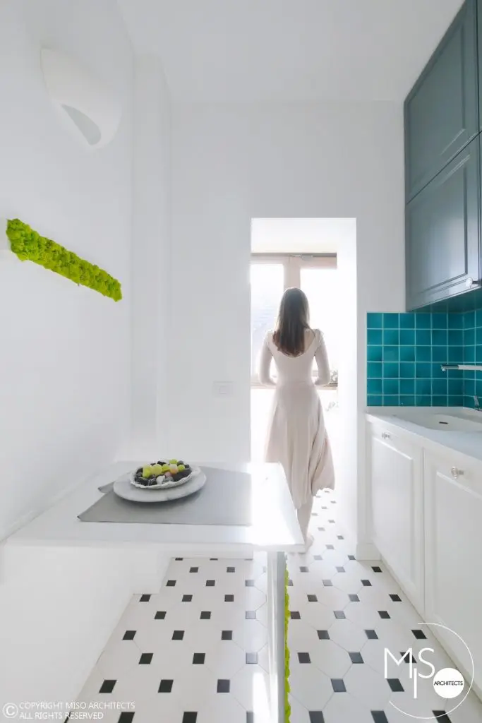 Bucataria a fost gandita sa functioneze optim in ciuda spatiului mic, de doar 6 metri patrati. S-a optat pentru o distribuire pe doua laturi, de o parte cu frigider si cuptoare incorporate, iar zona principala cu plita, chiuveta si cele doua masini de spalat, rufe si vase. Zona dintre blaturi a fost placata cu mozaic turcoaz, iar personajul principal al incaperii este de departe masuta pliabila pe perete, care se transforma intr-un tablou viu cu licheni decorativi.