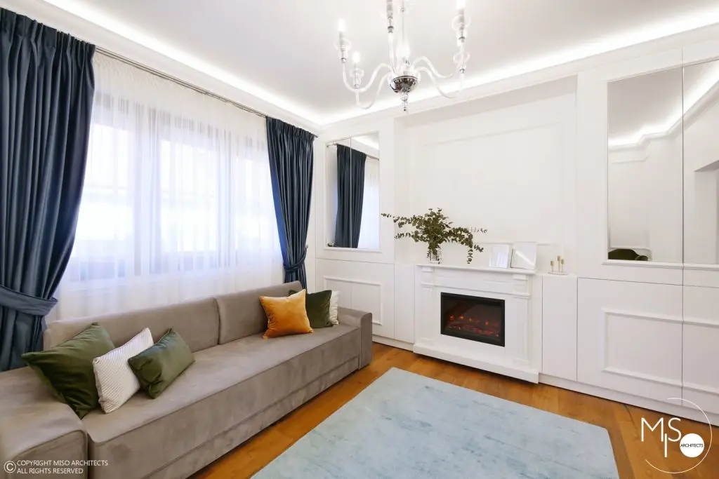 Livingul – este camera centrala, locul in care au fost concentrate elementele definitorii ale amenajarii. Mobilierul urmeaza designul peretilor prin preluarea profilelor decorative utilizate la decorarea lor. Au fost inserate si spatii de depozitare precum si un semineu electric.