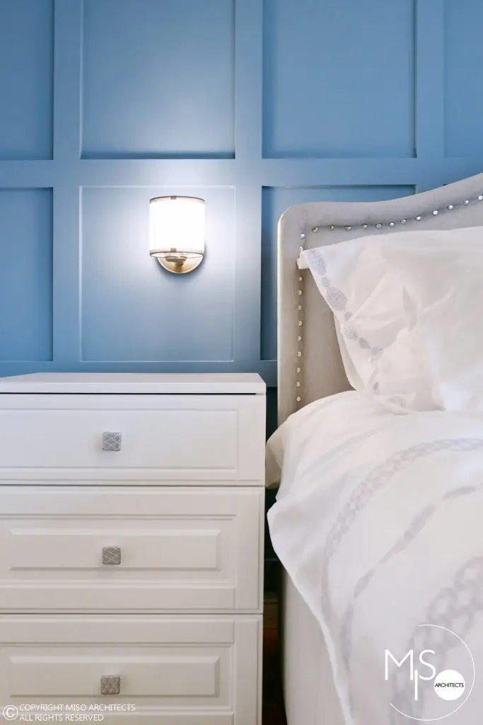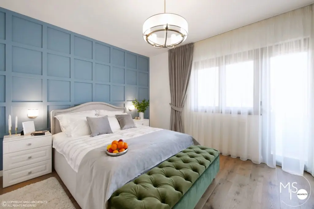 Dormitorul matrimonial are ca element cromatic principal albastrul pe care il regasim la nivelul peretelui-accent. Pe acest fundal a fost introdus patul tapitat, iar in fata lui adus un divan tip Chesterfield de culoare verde, aceeasi ca a fotoliului din living. Noptierele albe cu butoni decorativi apartin aceleasi povesti precum si dressingul cu usi albe si oglinzi dispus pe intreg peretele din fata patului. Candelabrul si aplicele intregesc absolut minunat imaginea de ansamblu.