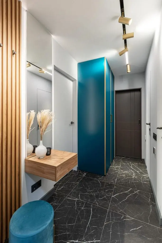 Accentele de portocaliu si nuantele de albastru ne intampina la tot pasul ceea ce ofera unitate si continuitate intregului spatiu. Putem spune ca aceasta cromatica ajuta la obtinerea unui interior echilibrat ce exprima masculinitate.