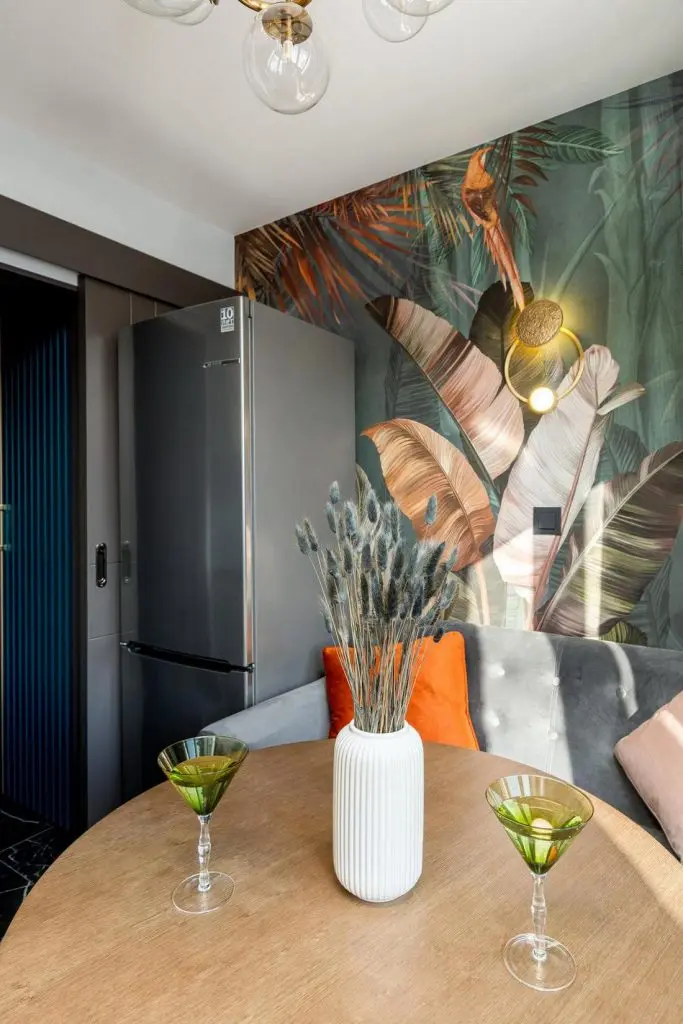Zona de dormit iese din tipar prin peretele accent creat cu ajutorul tapetului cu imprimeu de vegetatie tropicala. Reuseste sa aduca un plus de prospetime, culoare si un echilibru din punct de vedere estetic. Patul, cu o latime de 180 cm are la randul lui spatii de depozitare, folosite in special pentru lenjerie.