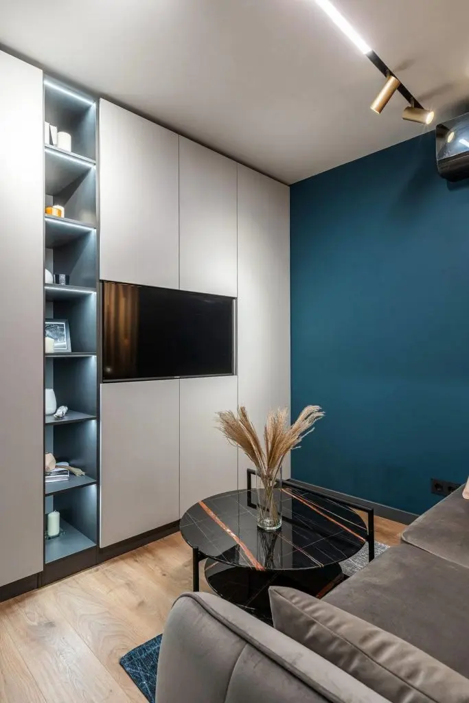 Living-ul desi este mic, dispune de tot ce este necesar pentru o zona in care sa terelaxezi, inclusiv spatii de depozitare. Corpurile de iluminat sunt prezente in toate zonele si reusesc sa creeze o atmosfera linistita, punand in evidenta in acelasi timp elementele decorative.