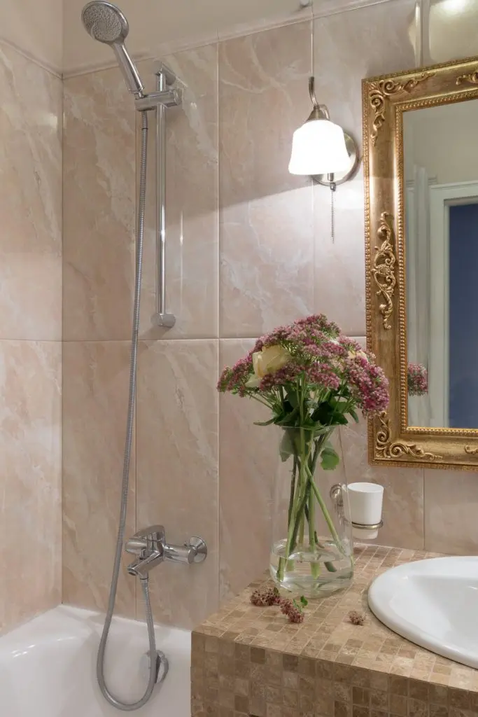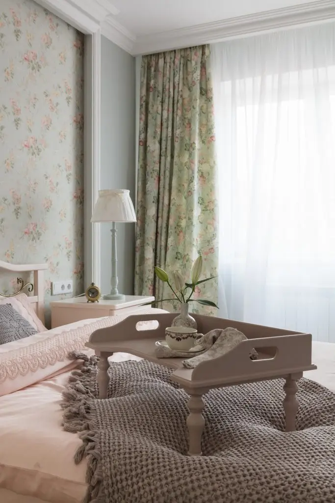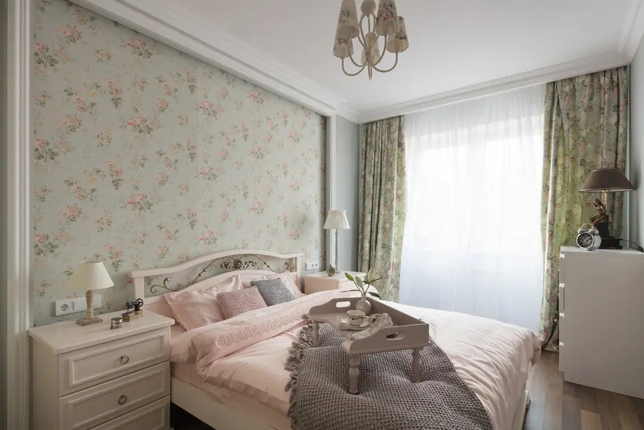 In dormitor avem o stilistica provensala usor mai pronuntata. Nuantele pastelate, tapetul si draperiile cu imprimeu floral, lustra si veiozele, precum si mobilierul creeaza un ambient placut si odihnitor. Pe aceeasi idee s-a mers si in amenajarea bailor (vezi cadrul de oglinda sau accesoriile).
