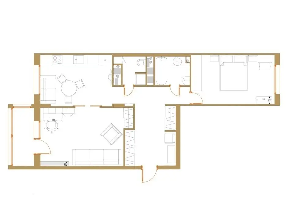 Apartamentul este configurat ca unul de doua camere, avand o suprafata de 63 metri patrati. Anna a propus o usoara modificare a intrarilor in living si bucatarie pentru a crea mai multa depozitare in spatiul holului. Astfel, intrarea in living dinspre hol a fost inchisa, usa de la bucatarie desfiintata, iar intre bucatarie si living au fost montate usi glisante. Zona de zi devine astfel una coerenta si unitara; usile deschise permit o circulatie fluenta intre cele doua functiuni, iar atunci cand se gateste, livingul poate fi izolat de mirosurile neplacute.