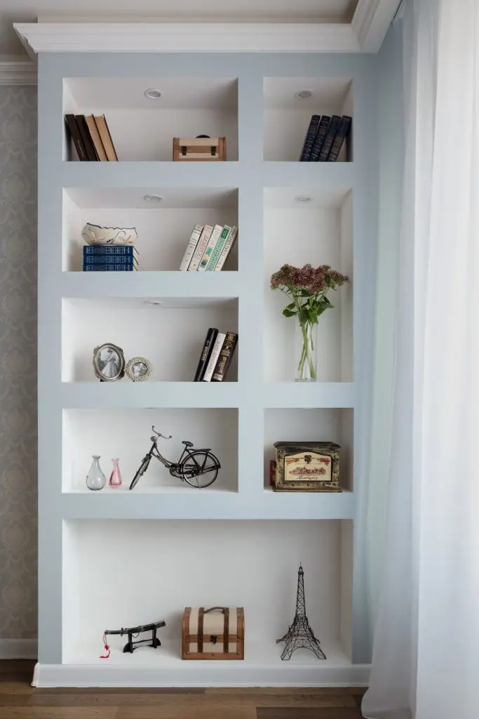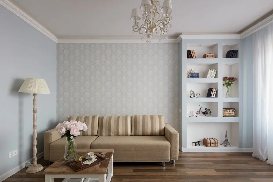 Pentru living a creat un decor simplu, dar placut. Un albastru pastelat alaturi de un crem foarte deschis constituie baza cromatica a camerei. Nu exista televizor aici, fiind mai mult un spatiu pentru relaxare, lectura sau socializare. La fereastra, a fost amenajat un corp de biblioteca intr-un soi de nisa special creat; arata bine si asigura loc pentru carti sau decoratiuni. Cornisele, tapetul, lampadarul sau lustra redau discret din stilul de la care a pornit acest proiect.