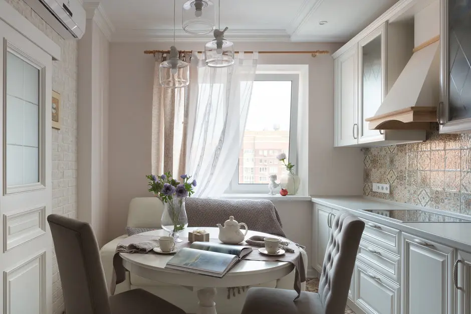 Amenajarea bucatariei este luminoasa, cu o atmosfera calda si primitoare. Aici a fost amenajat un loc de luat masa cu scaune si o sofa pentru un plus de confort, dar si o zona TV. Astfel, aceasta camera devine una multifunctionala: zona de gatit, de luat masa, de baut cafeaua, de relaxare, de lectura, de socializat cu prietenii sau chiar de lucrat. Fiind usor ingusta, Anna a ales ca dispunerea mobilierului sa fie liniara, cu o parte din electrocasnice incorporate. Din nou, usile frezate, designul hotei sau corpurile de iluminat amintesc discret de tematica amenajarii.