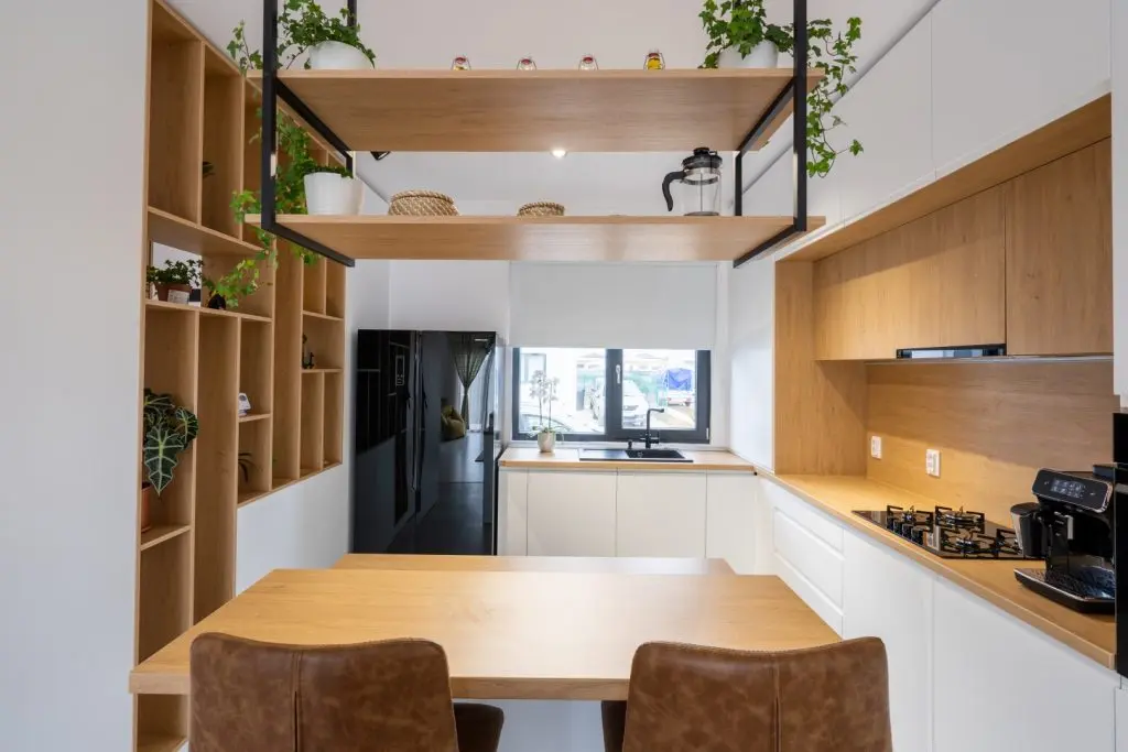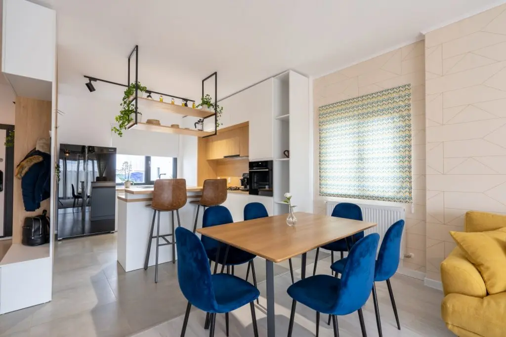 O insula de bar delimiteaza zona de dining de bucatarie, o solutie extrem de practica si eleganta. Avand rafturi de lemn si metal suspendate deasupra ei, si o pozitionare avantajoasa in cadrul zonei de zi, insula este ca un magnet de atractie pentru gatitul impreuna in familie sau cu invitatii la cina.