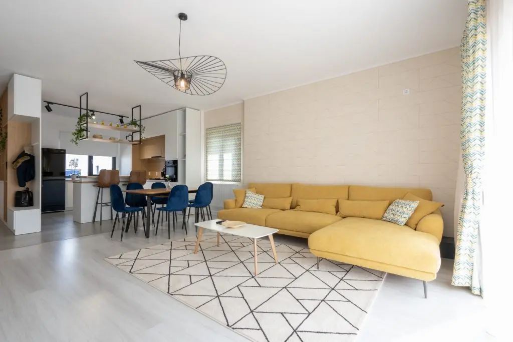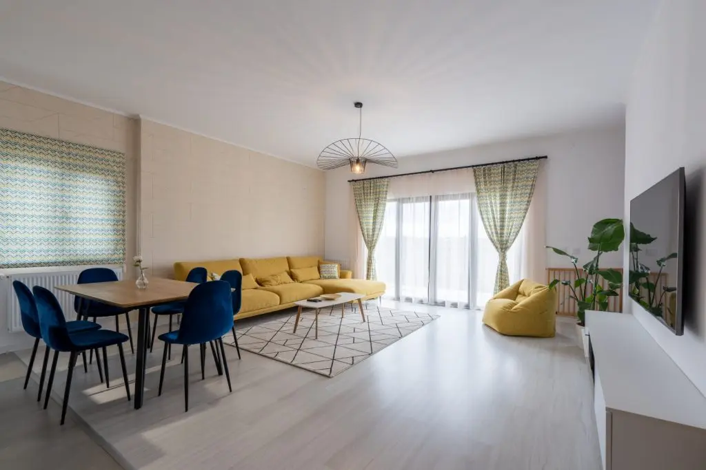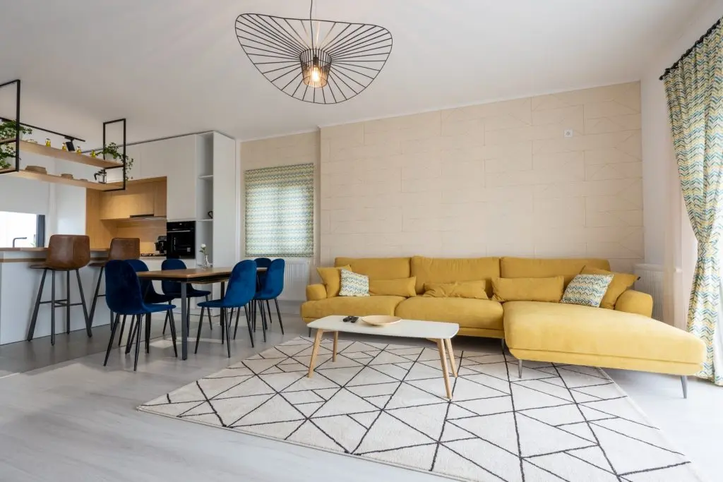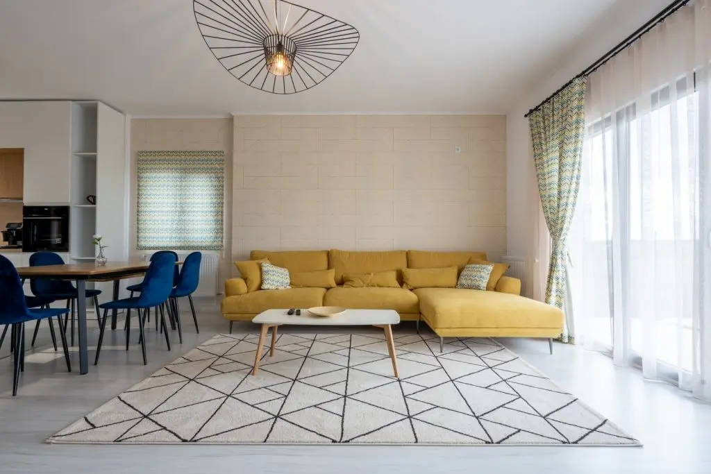 Regasim astfel scaunele tapitate intr-o nuanta de albastru puternic si canapeaua galbena din living. Aceasta imagine este intregita de un decor cu modele geometrice ( perdele, covor, tapet).