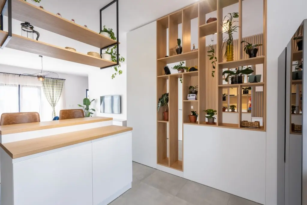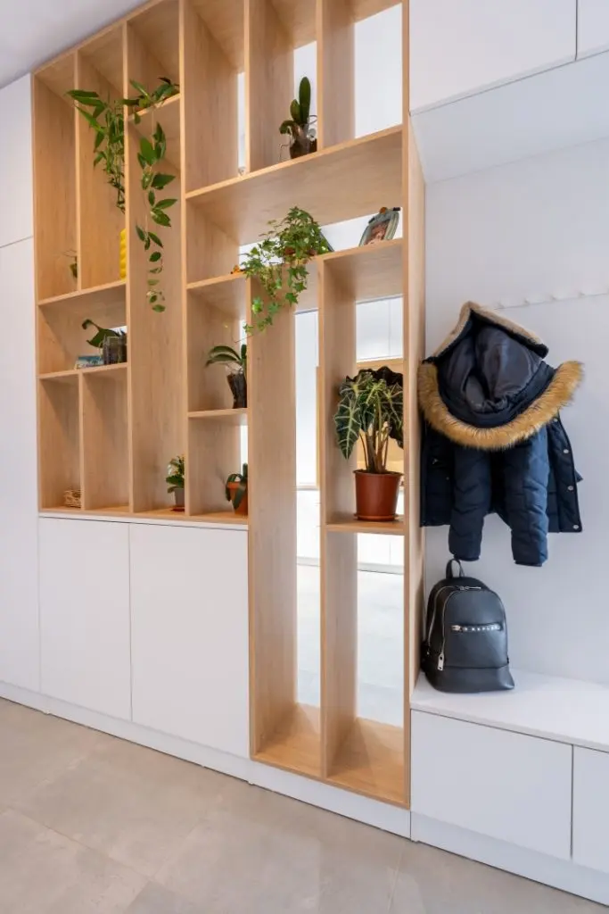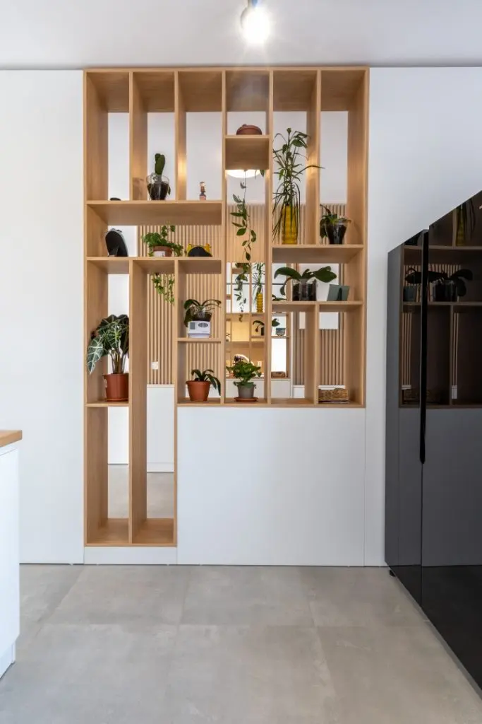 Holul este delimitat de bucatarie printr-un corp de mobilier cu rafturi alternante: deschise si zone inchise pentru a masca anumite depozitari. Acest ansamblu de mobilier are un rol functional important in orice locuinta si unul estetic, integrat armonios in conceptul general.