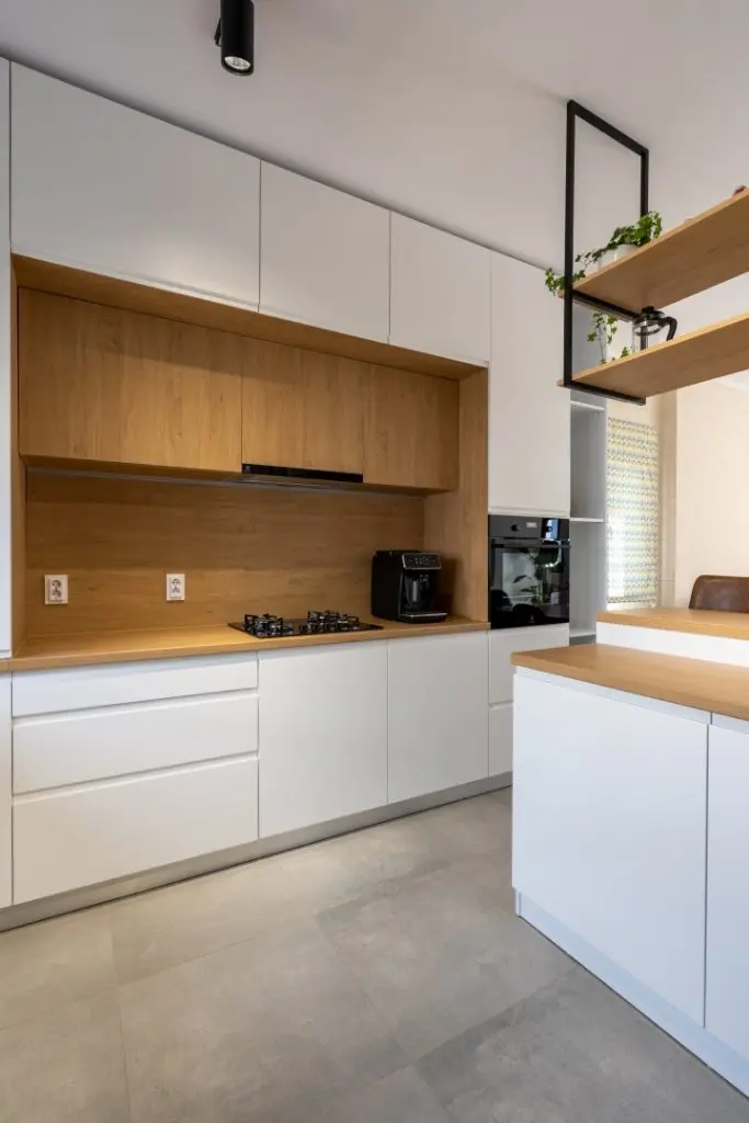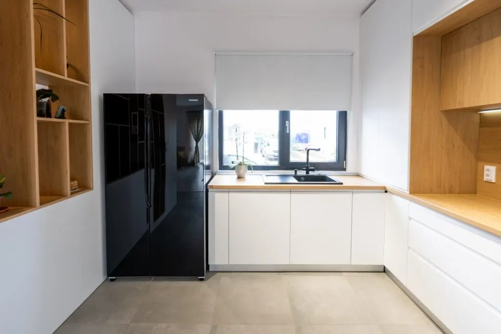 Bucataria spatioasa este o zona simpla si curata, gandita in linii drepte, cu accentul pus pe functionalitate si pe pastrarea imaginii stilistice de ansamblu a casei. “Fiind open space cu zona de living, am optat pentru o combinatie de alb si lemn, cu accente de negru, care sa nu concureze cu accentele de culoare din restul casei. Toata mobila a fost realizata la comanda.”