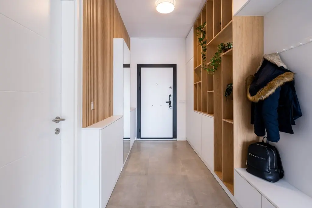 Peretele din dreapta holului (unde se gasesc diverse usi de vizitare si tabloul electric) a fost mobilat cu corpuri albe din mdf si o oglinda generoasa, mascand intr-un mod util elementele care nu doreau a fi vazute la intrarea in casa. Holul devine astfel un spatiu curat, neaglomerat, incalzit de nuanta lemnului si cu acces rapid la tot ce este nevoie.