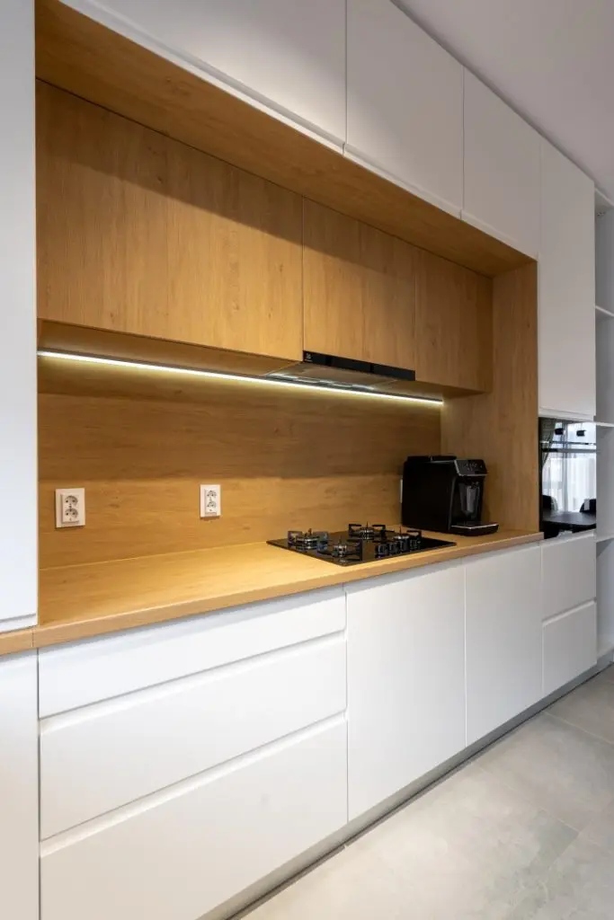 Locuinta a fost preluata de la dezvoltator cu finisaje la gri; designerii au optat pentru a incalzi totul cu nuante de lemn si accente de culori primare, saturate.