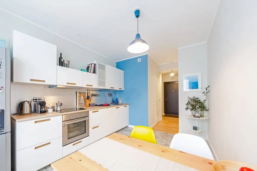 Si pentru bucatarie a fost gandita o amenajare functionala, cu tuse de culoare care inveselesc spatiul si ii reduc din caracterul tehnic. Cu mici accesorii din jurul mesei, plante, tablouri, lampa, bucataria se transforma intr-un spatiu nu doar pentru gatit, dar si pentru luat masa, stat cu prietenii, de lectura sau de lucrat. Peretele cu albastru, scaunele galbene si lampa rosie atrag privirea si contureaza o zona vesela si dinamica.
