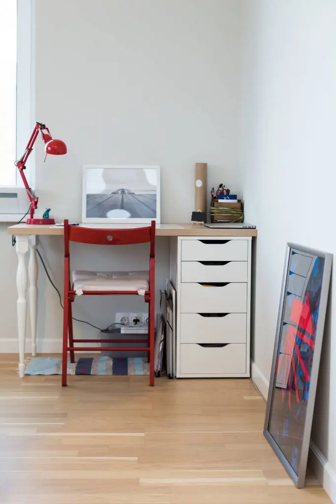 Primul pas facut a fost cel al zugravirii si inlocuirii finisajelor invechite. A optat pentru culori deschise, cu o baza de alb pe care a adaugat treptat accente de culoare, precum rosul, galbenul, albastrul in diferite nuante si tonuri adaptate fiecarei camere in parte. Pentru pardoseala a ales o nuanta deschisa de stejar care imprima caldura intregului apartament, exceptie facand bucataria si baia.