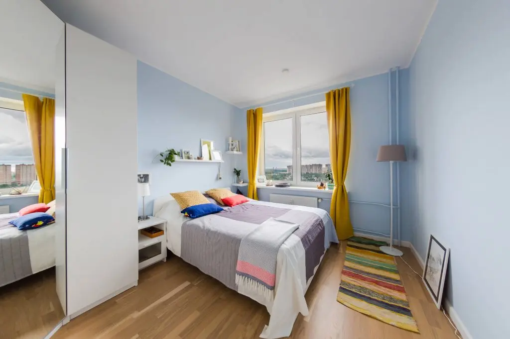 Dormitorul a fost ultima camera amenajata. Si aici regasim aceeasi paleta cromatica unde predomina un bleu-ciel ca baza a peretilor si tuse de galben si rosu echilibrate pentru a pastra un ambient placut si odihnitor.