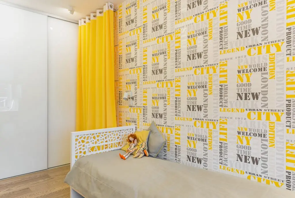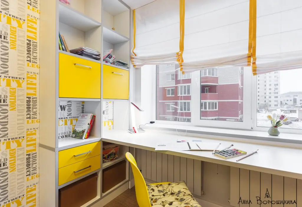 Camera copiilor ne introduce intr-o lume vesela si colorata, in care galbenul joaca rolul principal. Decorul este echilibrat cu alb, crem si bej, iar lumina naturala face ca spatiul sa para mai mare, mai aerisit. Tapetul cu imprimeu viu colorat creeaza un perete-accent ce atrage atentia de la intrarea in camera. La fereastra a fost gandit spatiul pentru birou, sub forma unui blat lung, cu depozitare pe ambele laturi.