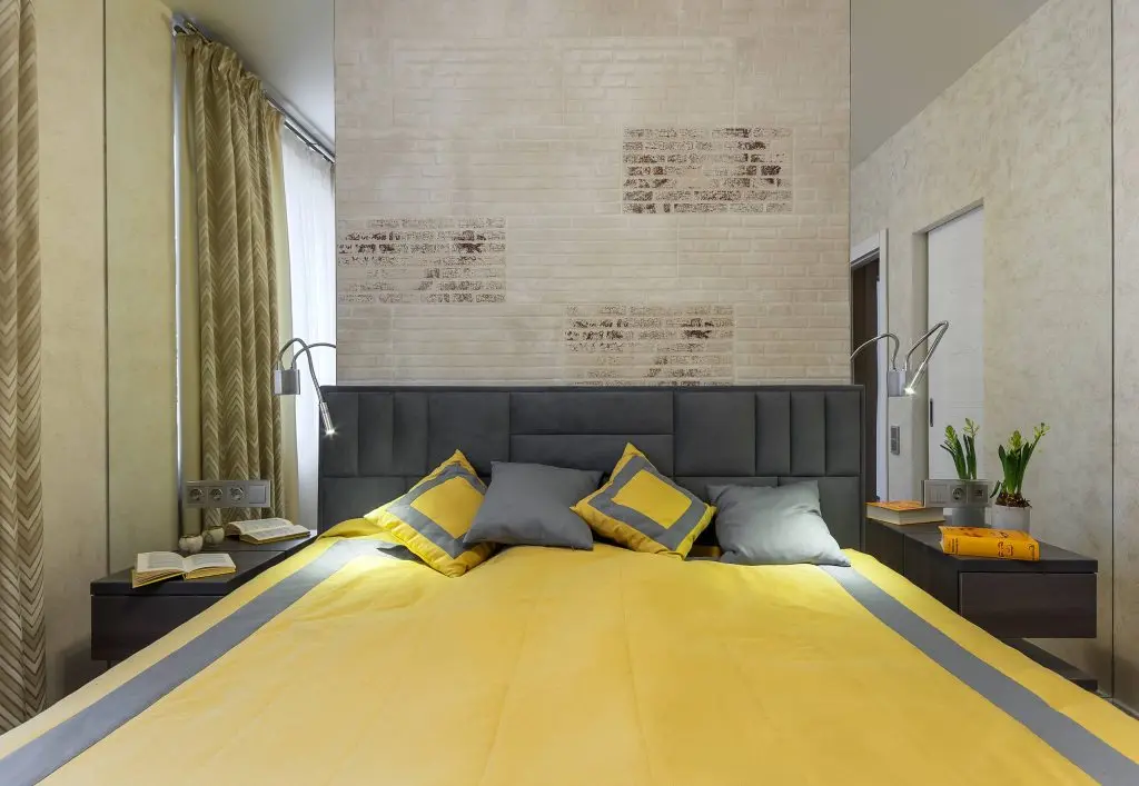 Pentru dormitor, s-a mizat pe nuante mai blande, neutre, mai odihnitoare. Galbenul este prezent discret la nivelul cuverturii si al pernelor decorative. Dorind sa creeze impresia de spatialitate, designerul a mizat pe o idee pe cat de simpla, pe atat de eficienta: montarea a doua oglinzi dispuse simetric de o parte si cealalta a patului. Pe mijloc a fost integrata o zona ce imita caramizile, iar tablia tapitata a patului aduce un plus de confort.