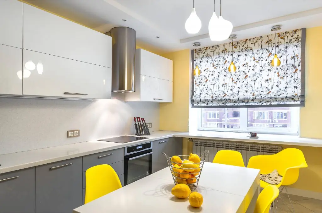 Si pentru bucatarie s-a mizat pe aceeasi linie minimala, dar cu accent pe functionalitate si, bineinteles, pe galben. Mobilierul este dispus liniar, cu spatiile de depozitare necesare; in plus, blatul de lucru se continua si de-a lungul ferestrei avand astfel mai mult spatiu pentru gatit sau luat o gustare sau pur si simplu pentru accesorii si decoratiuni. In centrul incaperii, a fost amenajat locul de luat masa cu o masa extensibila alba si scaune tip Eames galbene. Draperia in stil roman atrage privirea prin imprimeul sau vesel.