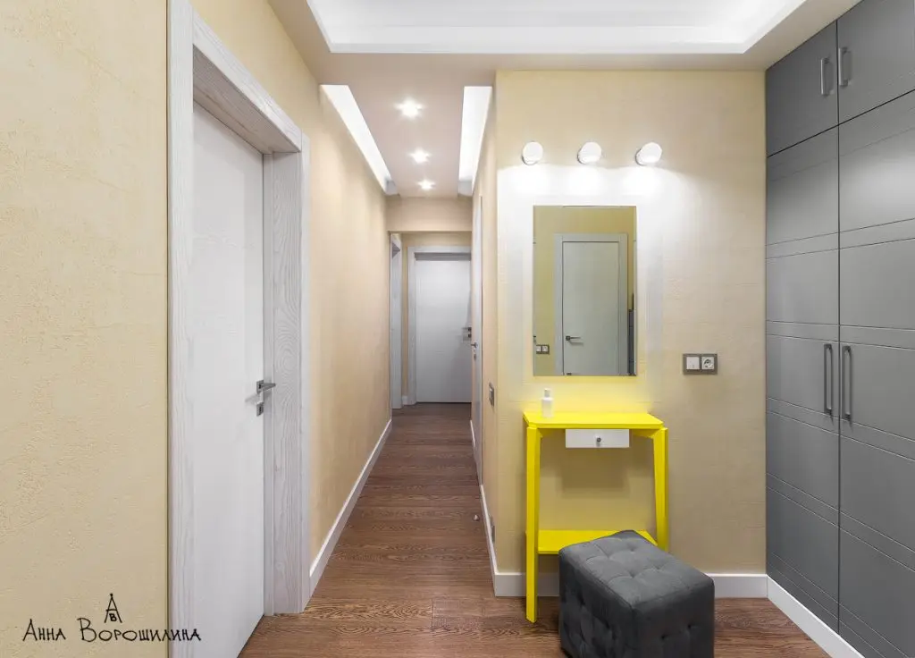 Pentru spatiul acestui apartament, designerul a mizat pe galben ca tematica cromatica principala. Astfel, il vom gasi sub diferite forme in toate incaperile, excelent integrat in decor.
