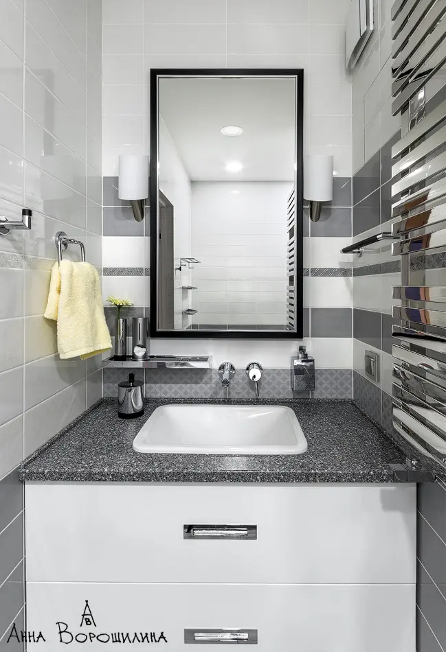 Functional a fost amenajat si spatiul din baie, astfel incat sa poata fi integrata masina de spalat rufe si depozitare sub forma a doua dulapuri suprapuse. Fiecare spatiu din acest apartament este o sursa de inspiratie si speram sa-ti fie de folos pentru propria renovare!