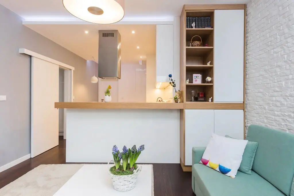 Atat bucataria, cat si livingul sunt amenajate intr-un stil minimalist nordic in care predomina albul care contrasteaza cu cateva obiecte in culori pastel.