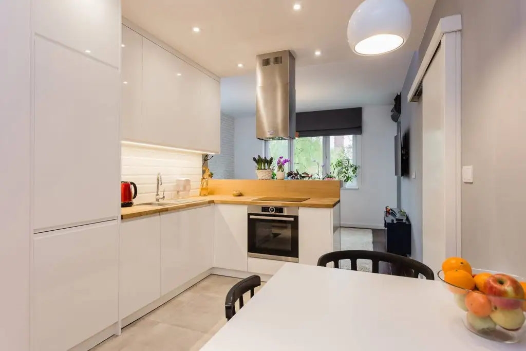 Bucataria si livingul imparteau initial acelasi spatiu. Designerii au reusit prin pozitionarea blatului de lucru, a hotei tip turn si a unui dulap sa separe functional cele doua zone, pastrand in acelasi timp senzatia de spatiu.