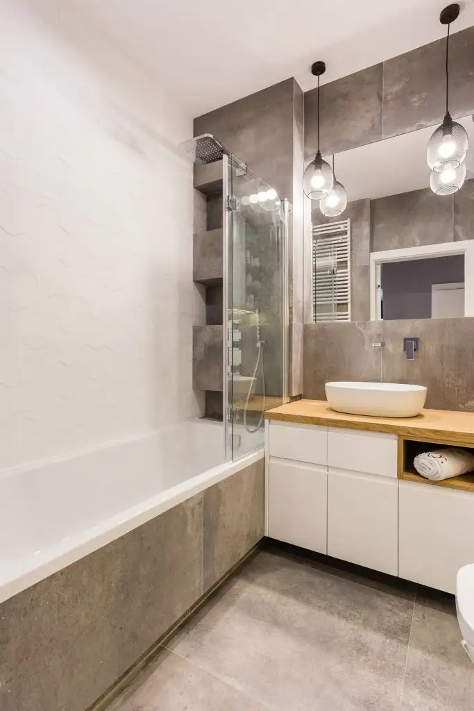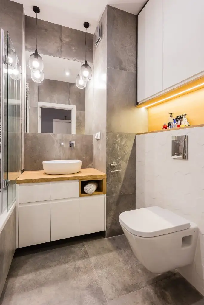 Baia in stilul industrial modern reuseste sa aiba suficiente spatii de depozitare in ciuda spatiului evident redus.
