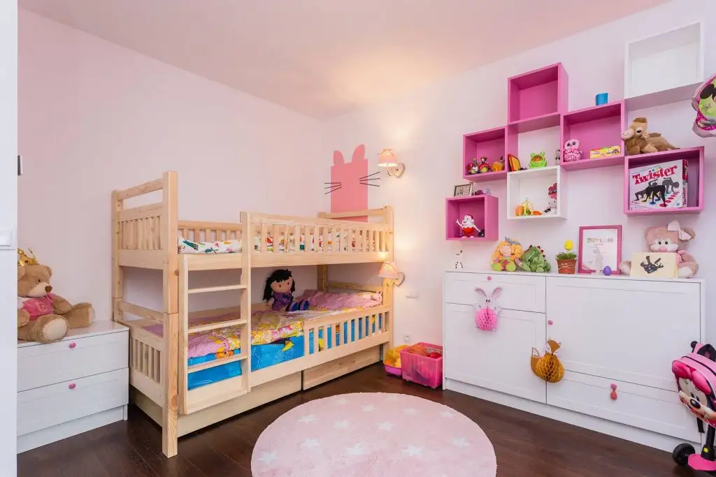 Cele 2 dormitoare contrasteaza ca stil: dormitorul matrimonial este amenajat intr-un stil industrial, pe cand dormitorul fetelor emana joaca si inocenta.