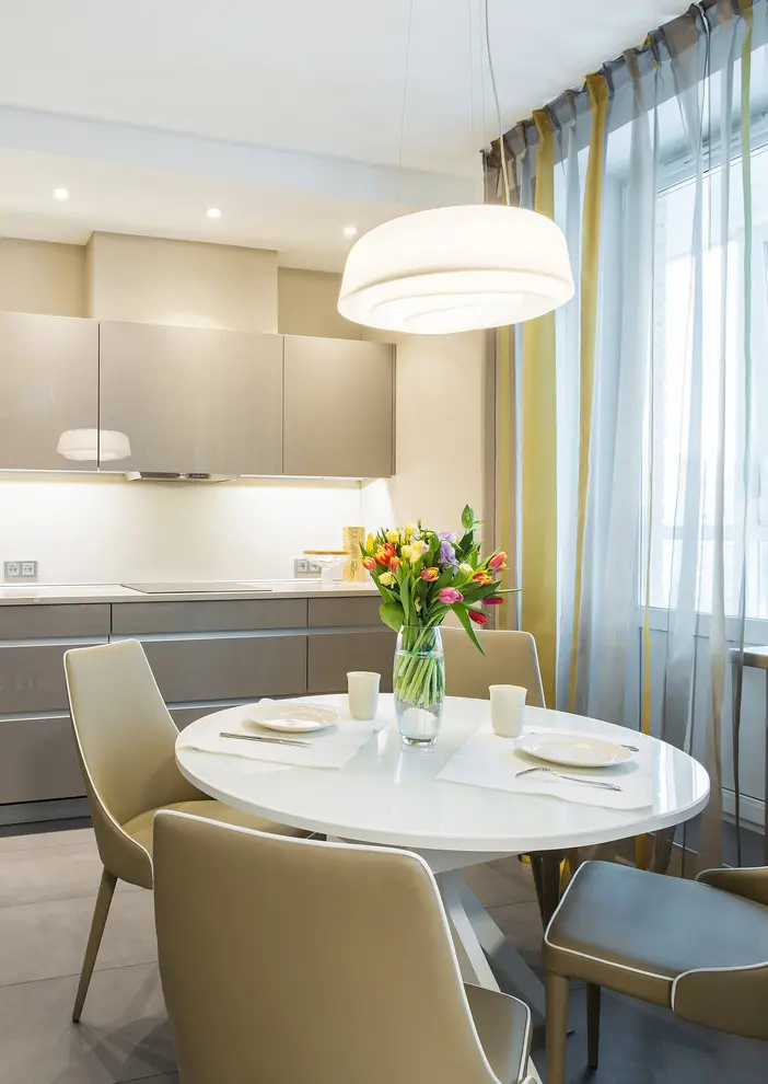 Luminile contribuie din plin la conturarea unui ambient cald si primitor, dupa cum putem remarca chiar si la nivelul bucatariei prin spoturile din tavan sau al corpului suspendat din zona locului de luat masa. In plus, pentru a scoate in evidenta acest mini-dining, o parte din peretele ce separa cele doua functiuni a fost vopsit cu albastru, iar perdelele colorate, translucide preiau discret motivul cromatic.