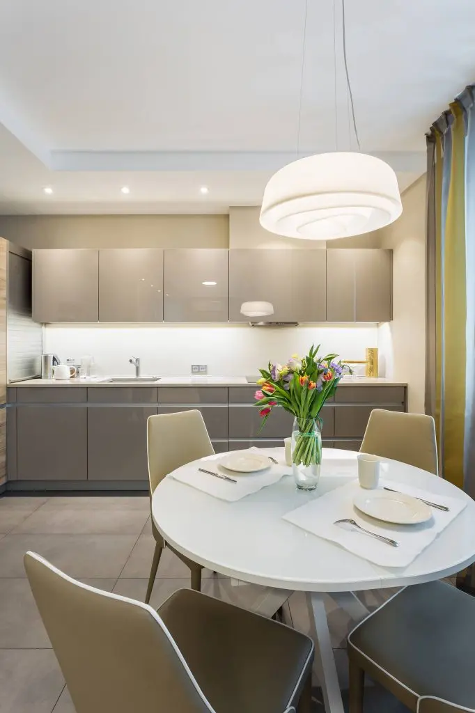 Bucataria a fost gandita ca un spatiu menit sa adune familia la un loc, iar comunicarea directa cu livingul elimina barierele fizice. Astfel, toti cei ai casei sau chiar prietenii in vizita pot interactiona in mod direct cu cel sau cei care se afla in bucatarie. Designul urmeaza o linie simpla, compacta, cu mobilier dispus pe o singura latura a bucatariei. Frontul lucios al dulapurilor reflecta lumina si creeaza o senzatie de amplificare a spatiului. Intrucat exista aceasta legatura cu livingul, electrocasnicele sunt incorporate pentru a pastra caracterul unitar si ordonat al decorului.