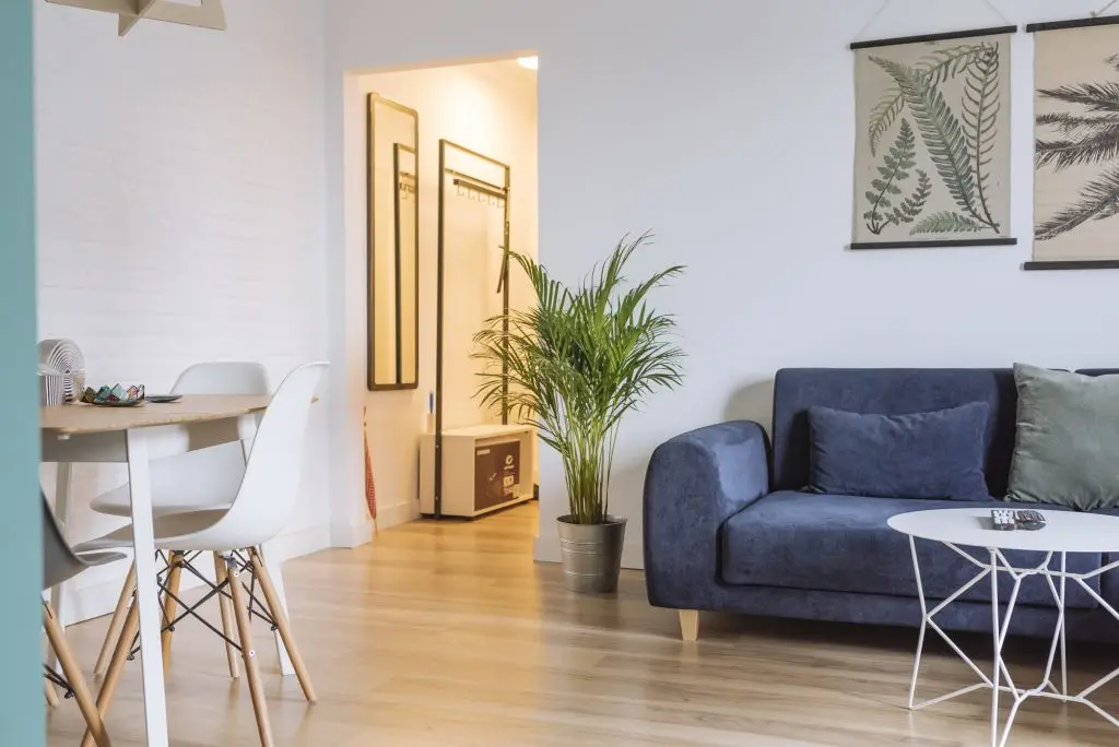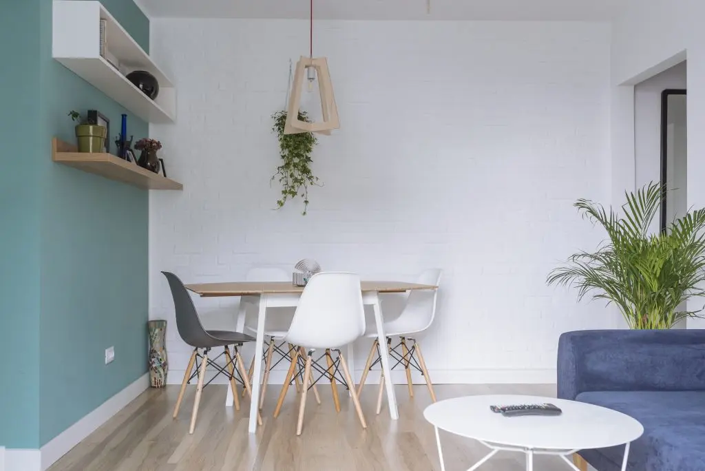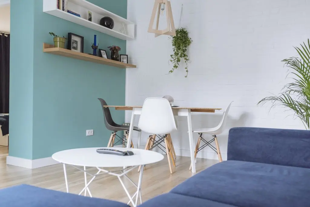 In camera de zi, cromatica este dominata de nuantele de albastru si turcoaz care se imbina excelent cu esentele de lemn natur. Amenajarea este minimala precum in interioarele tipic scandinave. Decoratiunile, plantele si mai ales corpurile de iluminat din lemn se imbina armonios pentru a contura un ambient placut si primitor. Tot aici a fost integrat si un mic spatiu pentru luat masa, cu scaune tip Eames, potrivite unui astfel de decor.