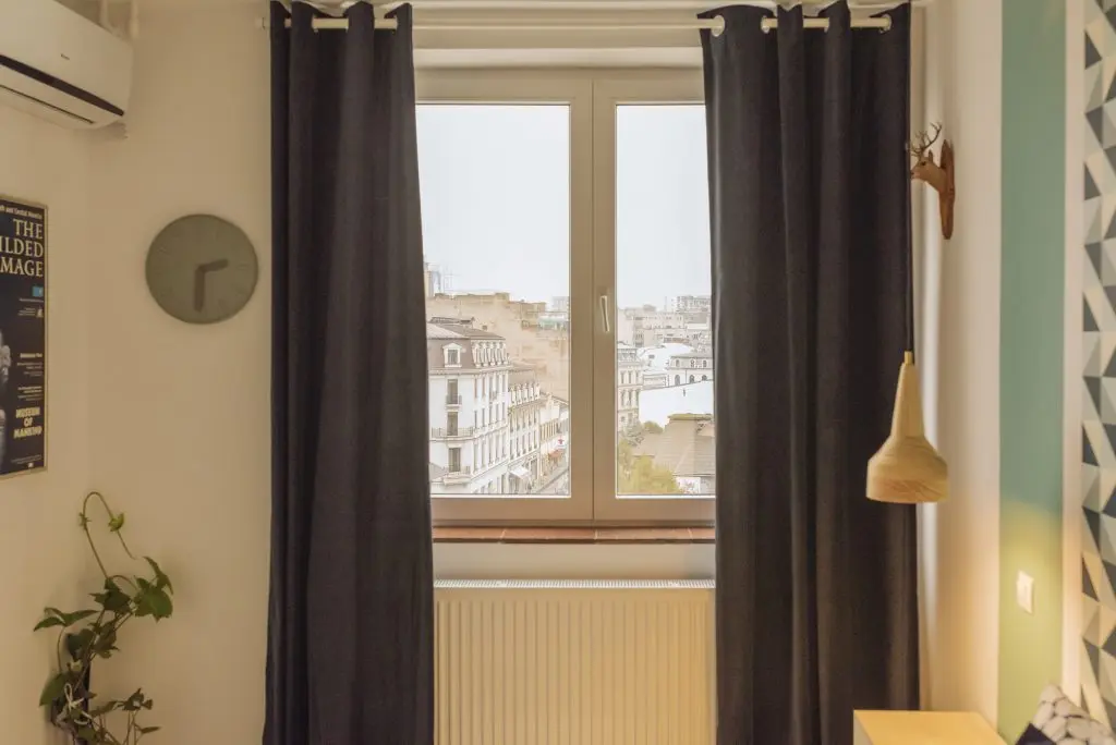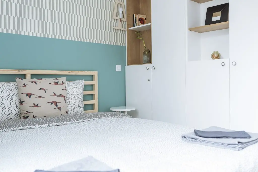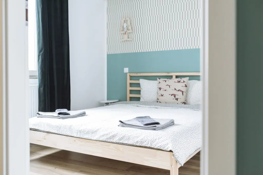 Tematica este preluata si in cele doua dormitoare. Amenajarea urmeaza o linie simpla asa cum o regasim si in living. Ca elemente de accent, Irina a optat pentru un tapet cu imprimeu grafic si vopsea in aceleasi nuante de albastru. Totul este echilibrat cu ajutorul albului si lemnului. Si zonele de depozitare sunt bine valorificate pentru a oferi spatiile necesare fiecarui turist indiferent de cat timp va petrece in acest apartament.